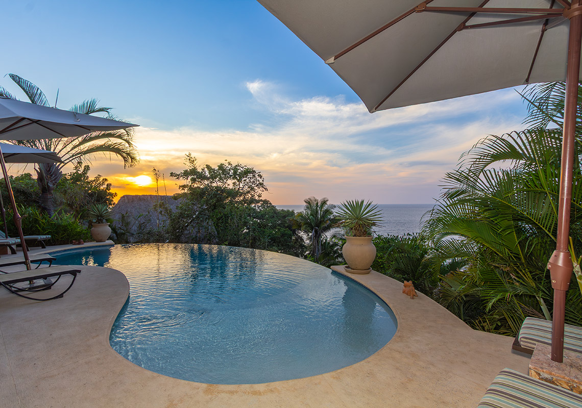 Surrounded by lush tropical gardens, the plunge pool area is perfect for cooling off after the beach and enjoying long, sunny afternoons with ocean views.