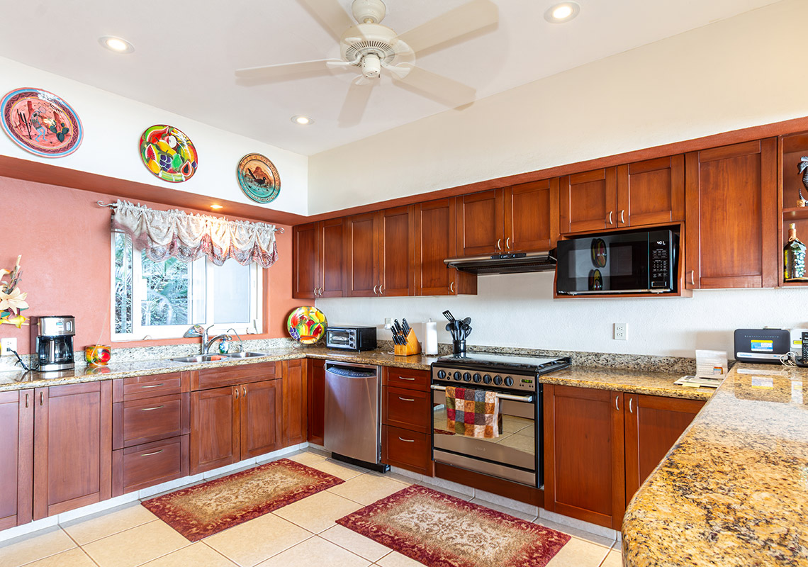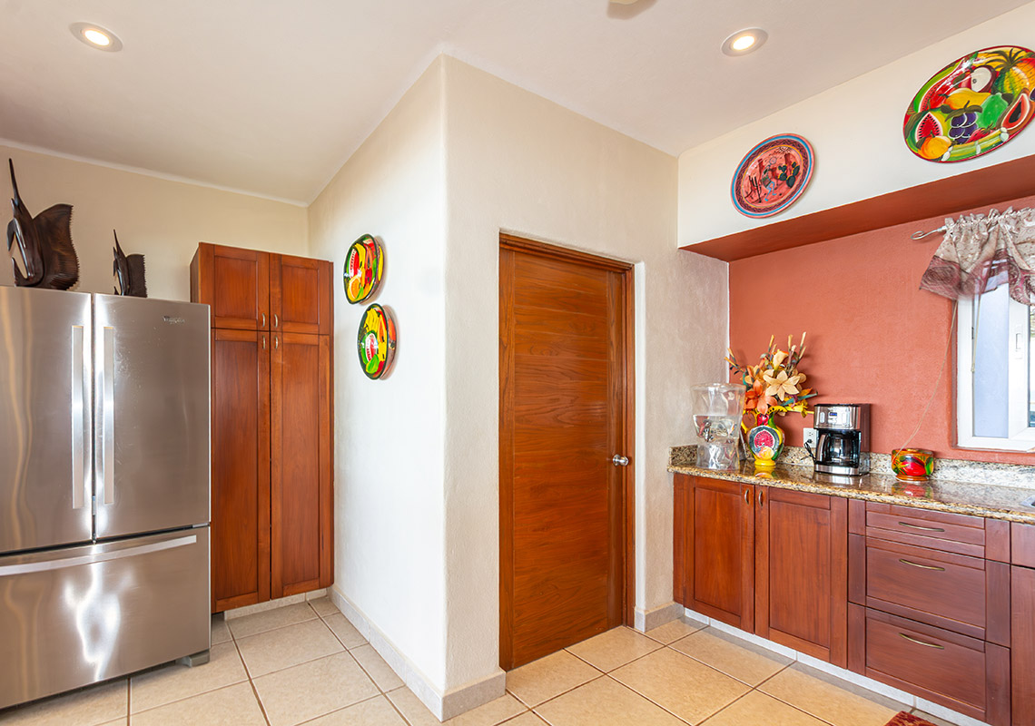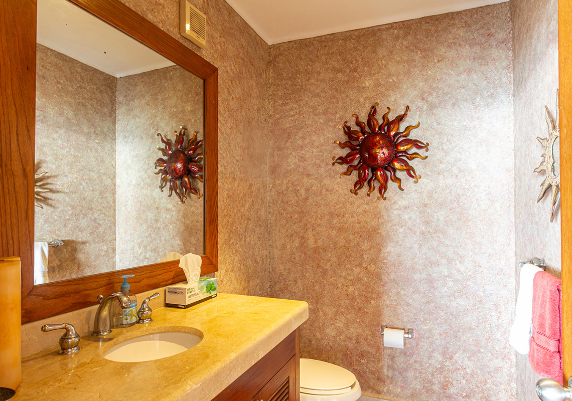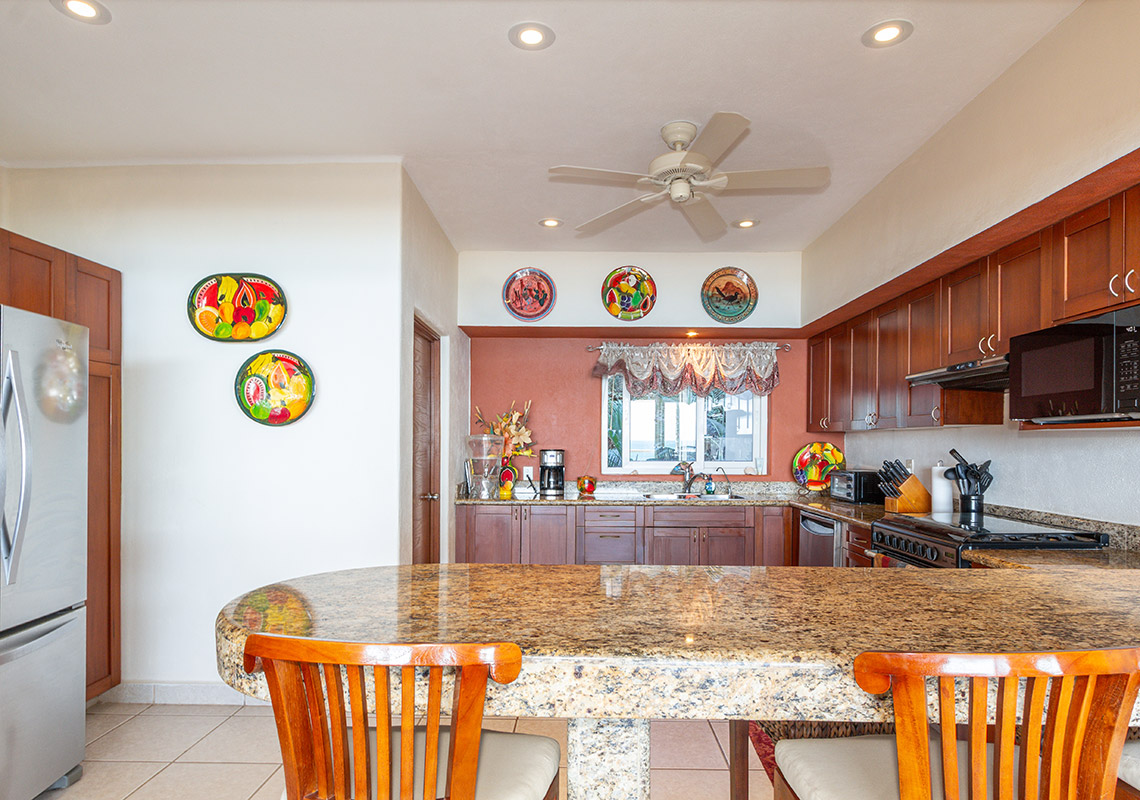 The social area is open, bright, and designed for effortless indoor-outdoor living. It includes a guest powder room and a fully equipped open kitchen with ample preparation space and an elevated bar, perfect for enjoying drinks and appetizers after a fun day at the beach. A laundry room is conveniently located at the back of the kitchen.